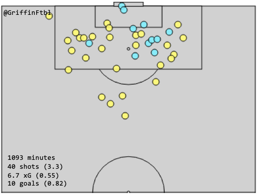 Below is his shot map from last season just in the Eredivisie, where played on the wings in all but one game. He had a 25% conversion rate and overperformed his expected goals. Compared to this season, there is a lower rate of shots from range and 45% of shots being in the danger zone, compared to 31% this season as a striker.