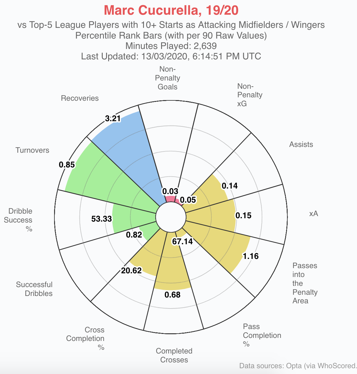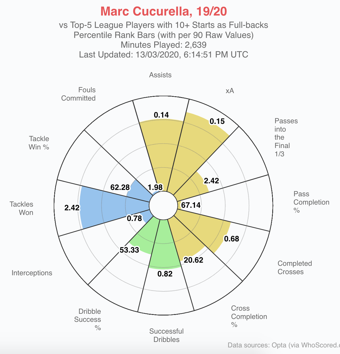 Statistically, Cucurella isn’t a remarkable player overall but has some standout stats. Below you can see his numbers in both the full back and winger templates. For a full back he has a good number of tackles and contributes to the attack well. For a winger, he’s in the 94th percentile for recoveries which shows his excellent pressing ability.