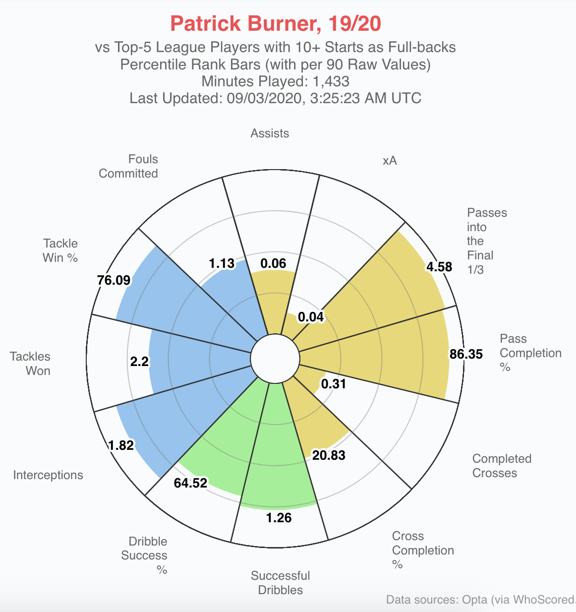 Burner’s radar is pretty much exactly as I would have expected from watching him. He makes a good amount of tackles and interceptions but also commits quite a few fouls, picking up 4 yellow cards and a red this season. Defensively he’s pretty good but can lose concentration a bit. At times he can lose his man down his wing with some simple dismarking play and allow them to run into space and get crosses away.