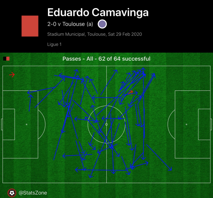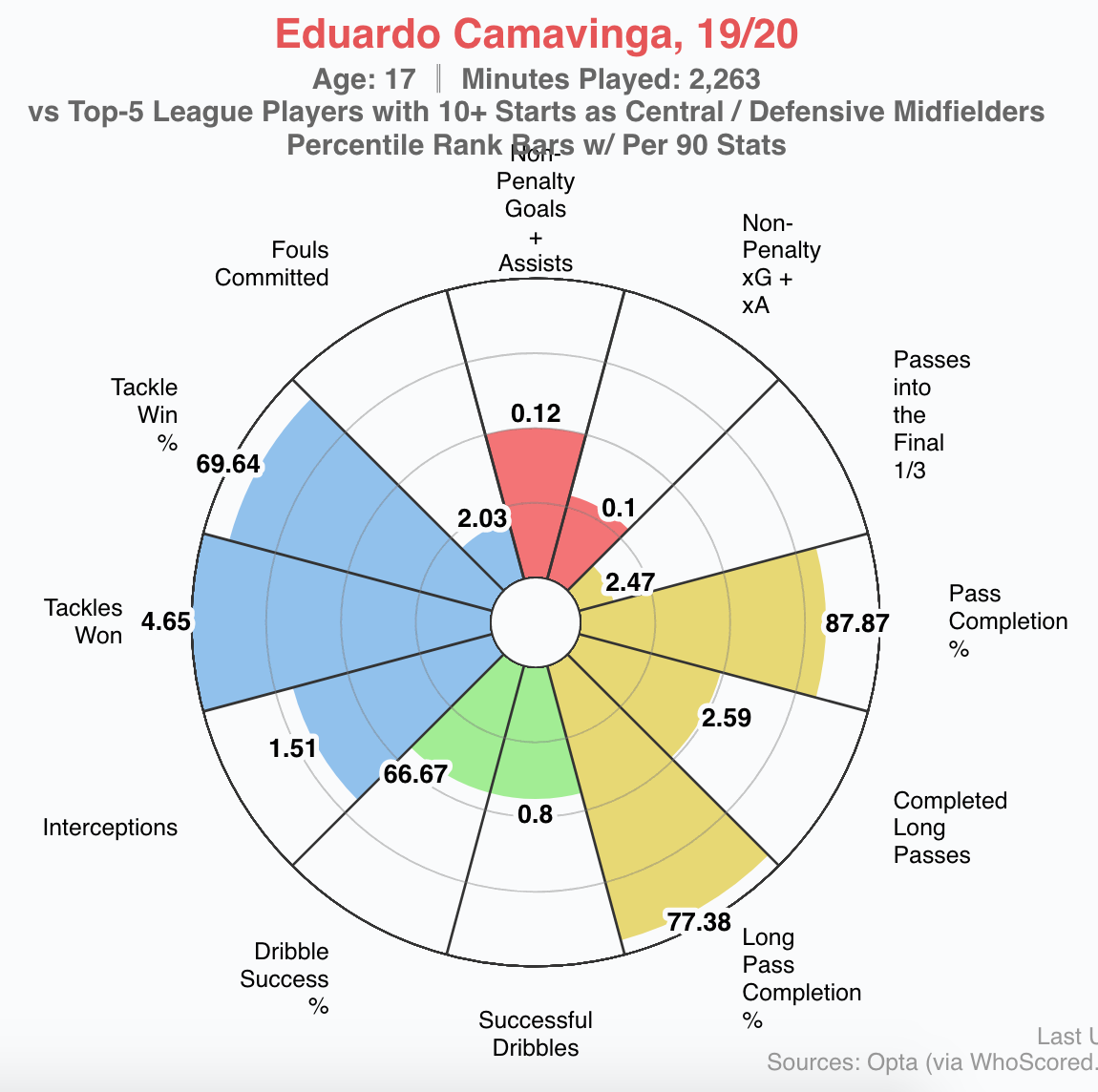 It isn’t hard to understand why Camavinga is such a valued prospect. At such a young age he has some of the best defensive numbers in Europe. This season he’s made the most tackles in Ligue 1. He has huge tackles numbers and is involved in a lot of duels. He’s an excellent tackler, he puts in well timed challenges and likes to dive in, he’s is great at connecting with the ball and poking it away. He’s patient in 1v1s, staying tight to the attacker while they travel, trying to slow them. Once they slow, he leans into the player and jabs in with a foot. If he’s coming across and the attacker is dribbling he puts in well timed sliding tackles.