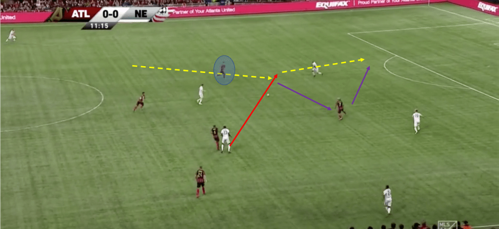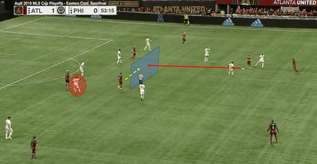 In Fig 4, Barco shows a good level of anticipation to read the play and create an opportunity out of nothing, having gone through on goal he really should have done better, taking the shot with his weaker left foot that went wide. This alertness means that defenders have little time on the ball or margin for error, especially when pressed liked Atlanta did in the example above.
