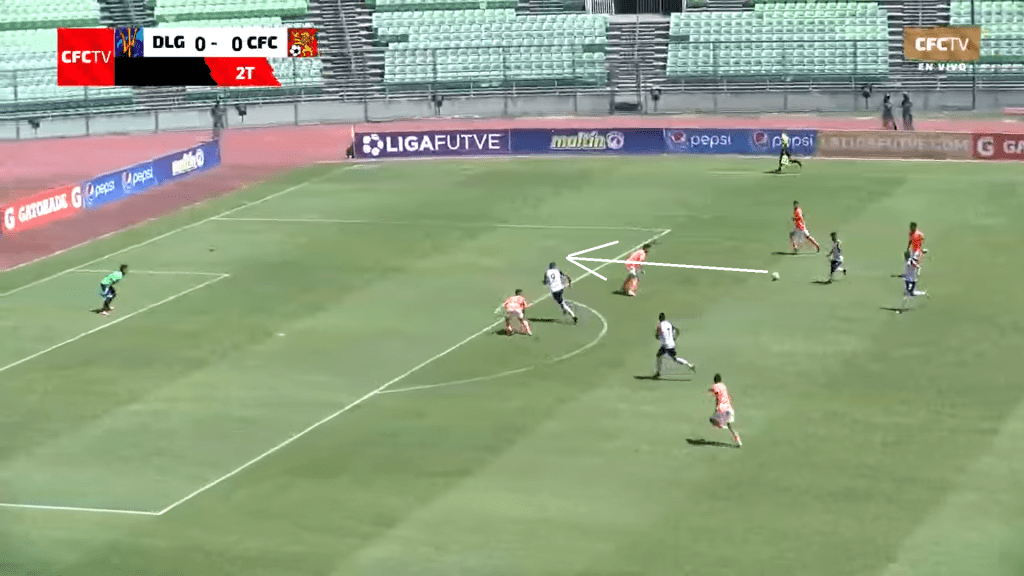 As mentioned above, the 20-year-old Venezuelan is a creative midfielder that likes to play smart passes and always has a creative solution. Even under pressure, Jorge Echeverría does well and manages to see the option forward. In the image down below, Echeverría is being put under pressure and he manages to find the space behind the left-back of Deportivo La Guaira, Leonardo Mosquera.