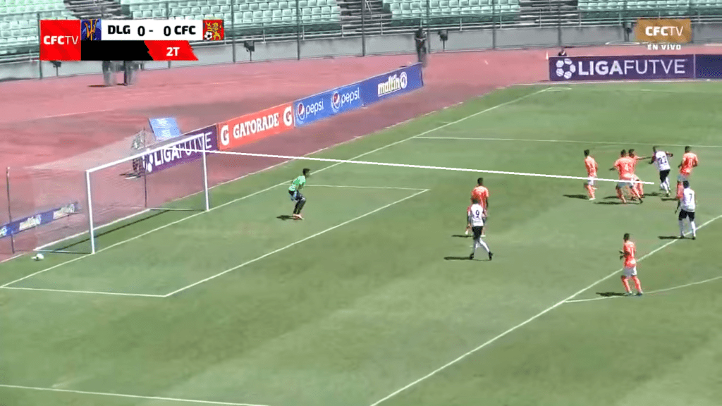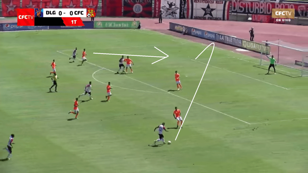 An aspect in which Jorge Echeverría still can improve is definitely his finishing. He did well to get into scoring positions because he has good spatial awareness and is able to dive into the gaps. However, he did not finish his chances and does not score that often. In the image down below, Echeverría has spotted a gap and manages to get into a dangerous situation, being able to assist his teammates.