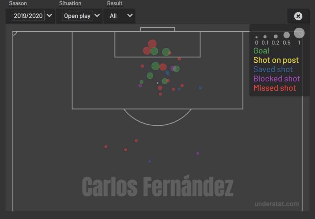 Another reason he is can be hard to play against is his aggression and his willingness to get in the face of the defenders and commit to aerial duels and challenges. Fernandez seems to enjoy the physical aspects of the contests and likes to put his weight about and make life uncomfortable for the opposition – in this regard he is very much a traditional number 9. However, this aggression can cross the line at times and land him in trouble as the Spaniard has received 7 yellow cards this season and commits 2.6 fouls per 90. Yet this aggressive streak and willingness to fight for his team are what make him such a valuable asset at times.