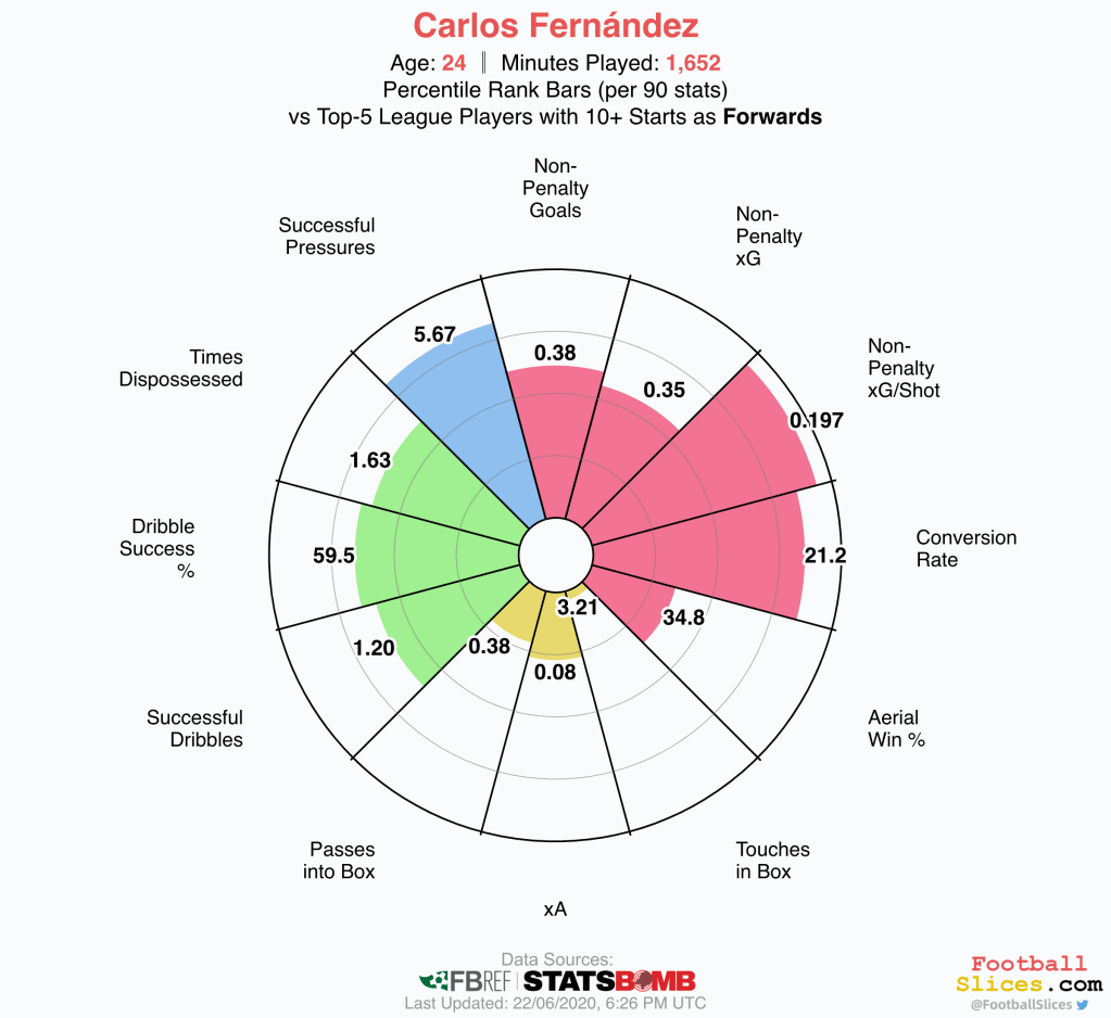 He is predominantly left footed and uses his stronger foot whenever possible, making over 70% of his attempted passes with his left foot, and actually even attempting more passes with his head (63) this season than with his weaker right foot (60). I have yet to see this left footed bias hinder his game, as he plays a more central role and so is often able to easily manoeuvre the ball onto his stronger foot. On the whole, Fernandez is capable of providing a real threat to the opposition and is clinical in front of goal, but needs to improve on the consistency of his ball retention in midfield areas to make him even more effective as a forward.