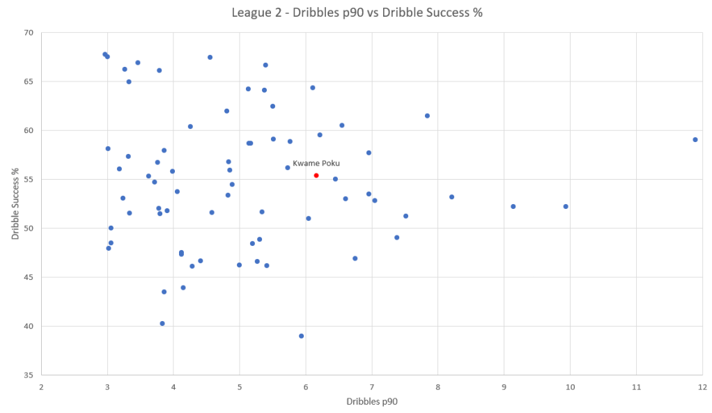 This shows some dribbling stats of players in League 2 with 1500+ minutes of game time. Poku ranks 16th highest for the number of dribbles per 90 which demonstrates his confidence on the ball and in his own ability to be able to beat a defender. He doesn’t complete his dribbles at the highest rate but he is successful with a good proportion of his attempted dribbles, with a completion rate of just over 55% he is a good bet to be able to go past his man.