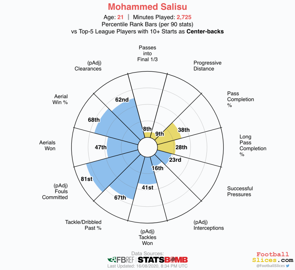 The defender is not afraid to step off his line to intercept/contest an oncoming pass and is usually successful. But, Salisu can be caught out of position and leave lots of space in behind for runners to exploit. Salisu will need to learn how to control his aggression and know when to step out and when to hold his position if he wants to take the next step.