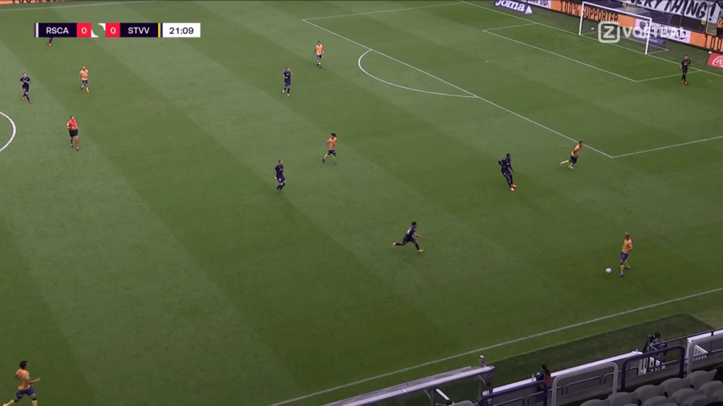 Samy Mmaee started out as the left sided centre back for STVV and played at right back for the last 30 minutes in the second half. Mmaee looks like quite a phyiscal centre back standing at 6’1”, but had issues with Anderlecht’s striker Dimata. Mmaee only won one defensive duel and needed to commit quite a few fouls to be able to stop the strong Belgian striker. He also let Dimata out of his sight a couple of times, which gave the striker a lot of space in the box. Samy Mmaee performed decently in aerial duels, but then seemed to struggle with clearing high balls.