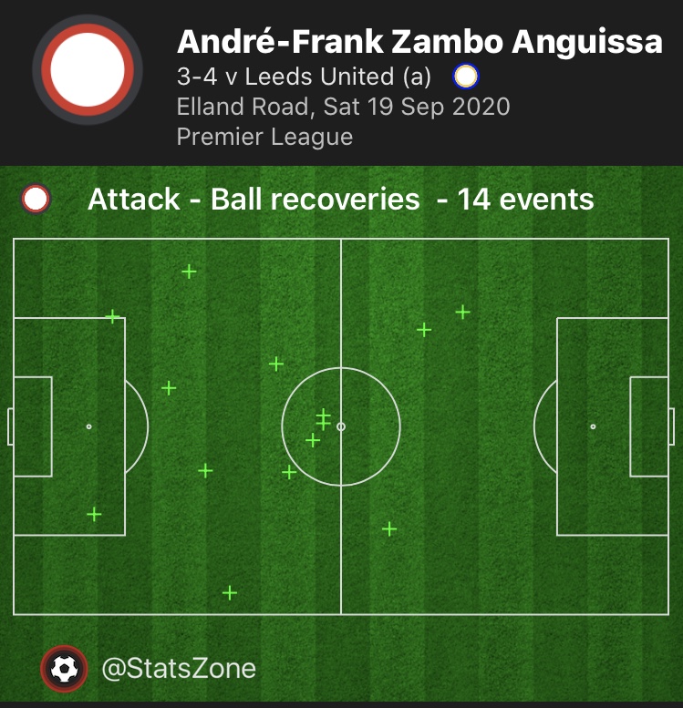 Defensively, Anguissa was equally as impressive. His strength was a huge asset in recovering possession and he managed a huge 14 ball recoveries during the game, his strength combined with his agility and long legs made it extremely difficult for the opposition to get past and it showed as he completed 4 out of 4 tackles in the game. Plus, Anguissa’s use of his arms enabled him to get some of his body in between the opposition player and the ball which he then used as a base to get more of his body in between the player and ball. Another impressive aspect of Anguissa’s game was his great reading of the play. He intercepted a dangerous cut back on the edge of the box due to his special awareness, reactions, and game reading ability. He also applied pressure to the opposition players before they received the ball – when an opposition player was in space and looked like the ball was about to be played into him, Anguissa applied heavy pressure and used his physicality to dispossess the player or force the Leeds player to play backwards.