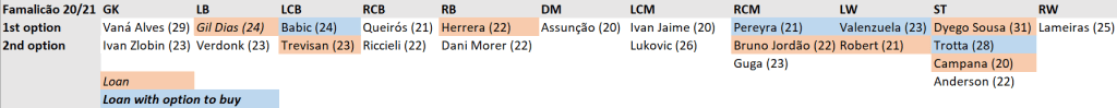 The current squad looks like this (see image below). There is a gap in defensive midfield and on the right wing. However, Gil Dias can play as a left winger and Fernando Valenzuela as a right winger when Ruben Lameiras is injured or suspended. Still, as Gil Dias has been good as left-back, I think that he should be playing as a left-back this season for Famalicão. Fernando Valenzuela has mainly played as a right winger throughout his career, but he also does very well on the left. It is preferable that both Gil Dias and Fernando Valenzuela can play in their own position when Ruben Lameiras is injured and that there is a backup option for the Portuguese winger.
