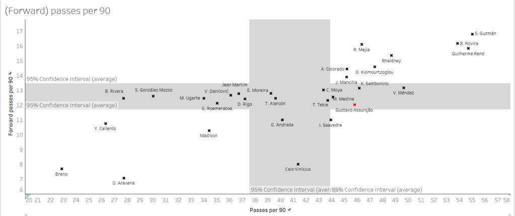 For this position, stats were significantly less important than for the search for a right-winger. Gustavo Assunção’s main asset is his off the ball movement and efficiency in the first part of the build-up play, which don’t reflect in stats. This means that I was less eager to use stats. However, I still decided to look at passes p/90 vs. forward passes p/90, progressive passes vs. progressive runs and defensive duels won p/90 vs. successful defensive actions to see which players stood out in these aspects.