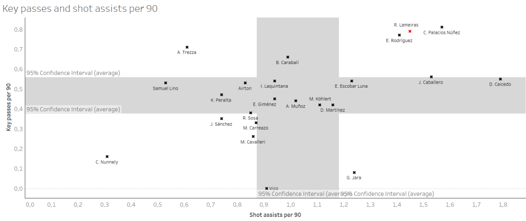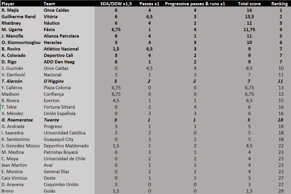 Note: if one to three players really stand out in one or both stats, they will get an extra 0,5 point (e.g. Nunnely in xG, Palacios even got an extra point as he stood out by far in both progressive passes and deep completions, Airton, Cavalleri and Laquintana in successful dribbles).