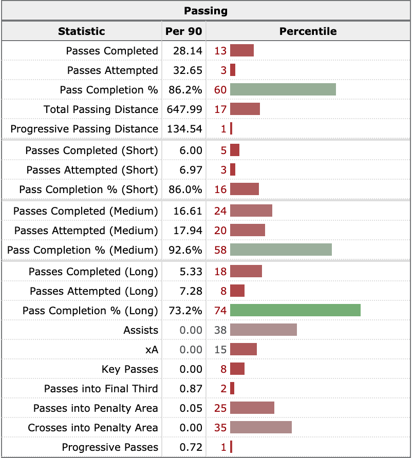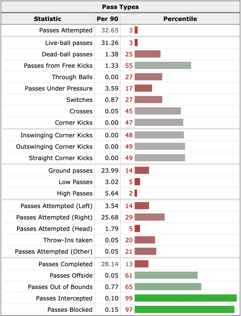Above, you can see his passing statistics from Fbref. He’s in the 3rd percentile for passes attempted, 2nd for passes to the final third, 1st for distance progressed and progressive passes. So it doesn’t make for good reading. His technique is okay on his short, simple passes, they are slightly underhit though. He’s capable with both feet and deals with pressure calmly but doesn’t pass forwards and doesn’t enjoy the buildup side of the game at all.