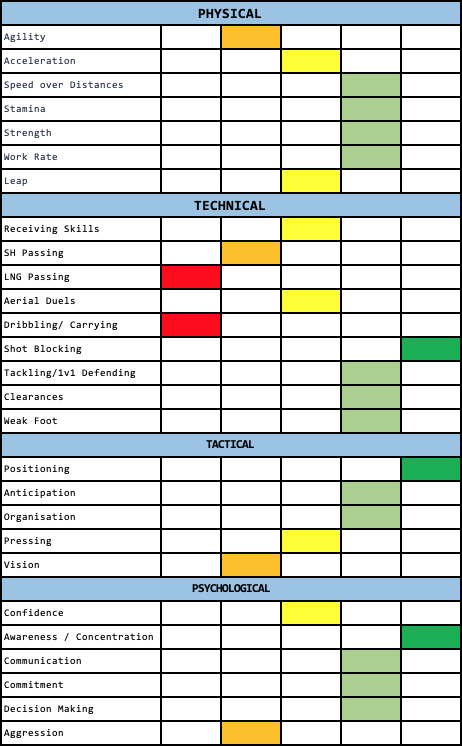I’m going to start with my conclusion and overall thoughts on Konsa and then if you’re interested in my reasoning and some detail then you can continue to read. Here you can see my overall ratings on Konsa’s attributes in line with the FA’s Four Corners. This is relative to Premier League centre backs, so yellow means average for a Premier League defender, light green is above average, dark green means very good.