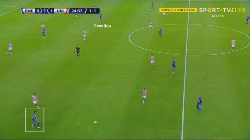 First of all, there is a situation where Joao Rojas drops deep while sticking close to the sideline. He opens up a passing lane for the left-back, often Jackson Rodriguez or Oscar Bagui, which can be very effective when Emelec are being put under pressure. When Rojas is playing as a left winger, it often happens that the attacking midfielder (Cevallos) is not that active in the build-up as Rojas is. This means that Rojas either needs to take on his opponent or pass it backwards to Bagui again, which does not help Emelec progressing the ball further up the pitch as Rojas does not have any passing options. Also, dropping deeper attracts the right-back to follow Rojas which opens up space on the left wing but there is no-one to dive into that gap.
