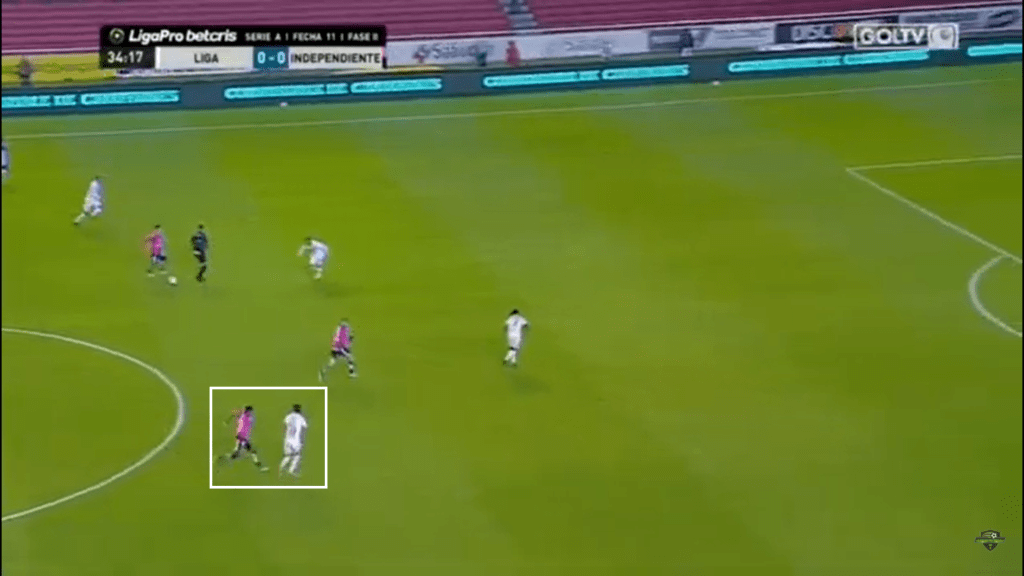 He very rarely takes a progressive touch, like in the image down below. González gets past his opponent by taking a good, progressive touch and is immediately able to progress the ball further up the pitch and create a dangerous situation for LDU Quito.