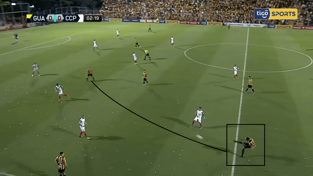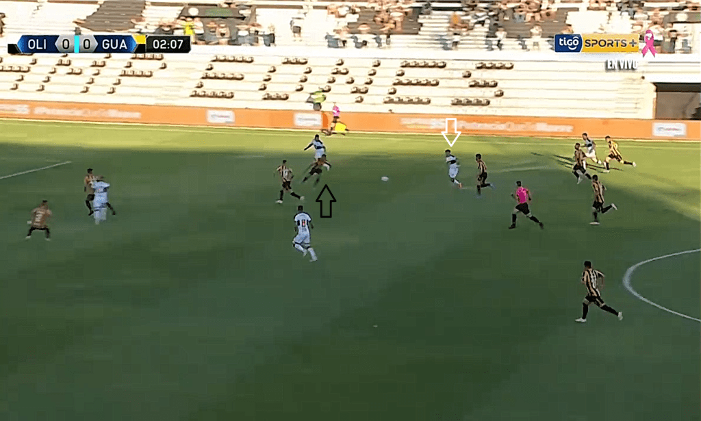 In the matches against sides like Cerro Porteño, Club Libertad and Club Olimpia, Guarani have a more defensive approach in the match. This is when they play with a more direct approach and don’t build up often with three central defenders. However, when they get time on the ball they still try to go for this approach.