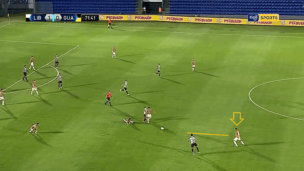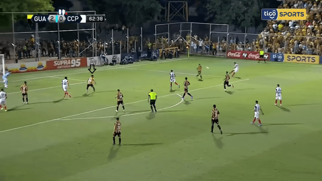 In the image down below, you can see that Roberto Fernandez isn’t in the ideal position after moving too far to the (from his point of view) left. He gets wrong-footed by the Cerro Porteño attacker (on the ball) and needs to turn to the opposite side first. Fernandez is out of position, does not spot the run of the Cerro Porteño player and fails to cut the passing line because of that. This action did not result in a goal for Cerro Porteño, but this mistake can not be made in a more demanding league.