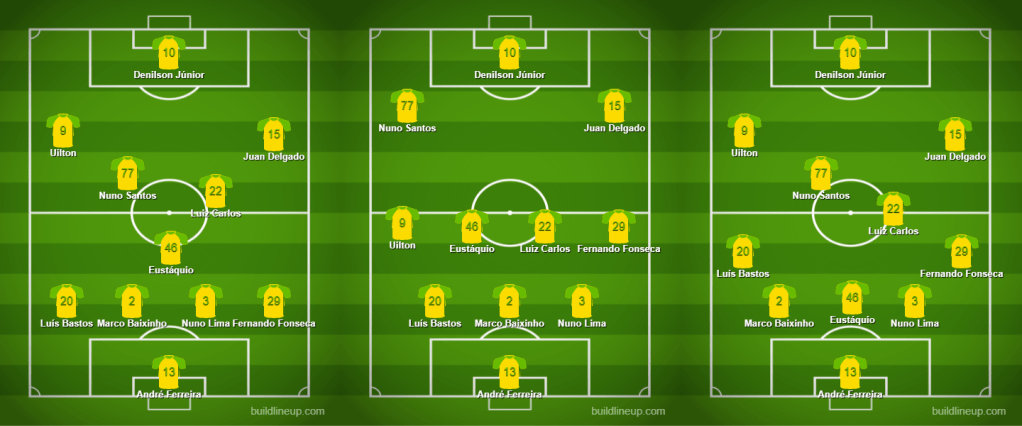 César Peixoto’s lined up in a 4-3-3 formation, which especially in the first half didn’t look like a 4-3-3. Left-winger Uilton would often drop back and almost play as a left wingback, whilst Nuno Santos stayed forward more, making it more of a 3-4-3.