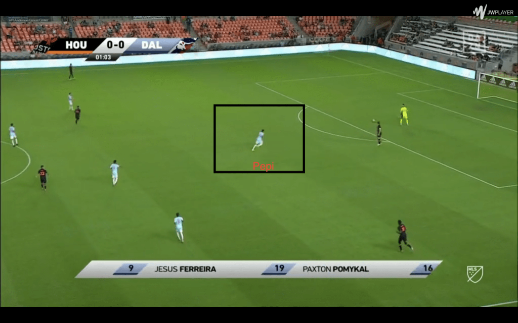 In another example, we see Pepi recognize that a Houston midfielder is dropping deep to receive the ball from centre-backs.