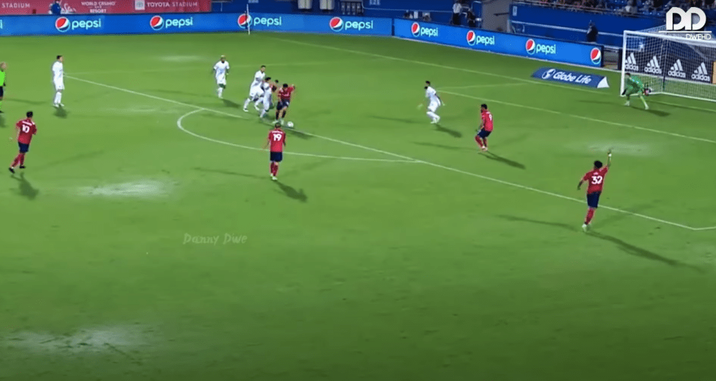 One thing that stands out from Pepi’s game right away is his work rate. He is very eager to press opposing defenders, whether that means pressing from the front or dropping back into midfield to try and disrupt the opposition build-up. But, often he finds himself pressing all alone or is out of sync with his teammates. It is difficult to say to what degree this is him not gelling with his team’s tactics and to what degree it is his teammates not recognizing opportunities to put the opposition under pressure. After all, F.C Dallas may be hot stuff when it comes to moving young players to Europe but when it comes to winning games in Major League Soccer they are not very good at all.