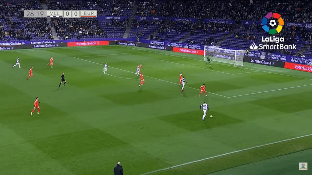 Pacheta’s Real Valladolid lined up in a 4-4-2 formation against Burgos. The fullbacks often played up very high and positioned themself a bit more narrow than the two wide midfielders. With the help of the centre midfielders, or one of the strikers, they often created overloads in the wide areas and then tried to get the ball behind Burgos’ defenders.