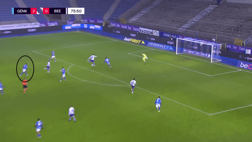 After Junya Ito got a penalty for Genk, he first gave the ball to Ike Ugbo to take the penalty, but in the end Theo Bongonda was the one who claimed the ball. I almost bad for the Canadian striker, born in London, who played a fantastic game, but was just very unlucky with his finishing against Beerschot. Ugbo had two moments where he made a great run from his opponent’s blindspot and got in a 1v1 with a goalkeeper. The first time the goalkeeper saved his chip really well and the second time the pass was just too far from him to reach well.