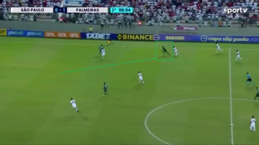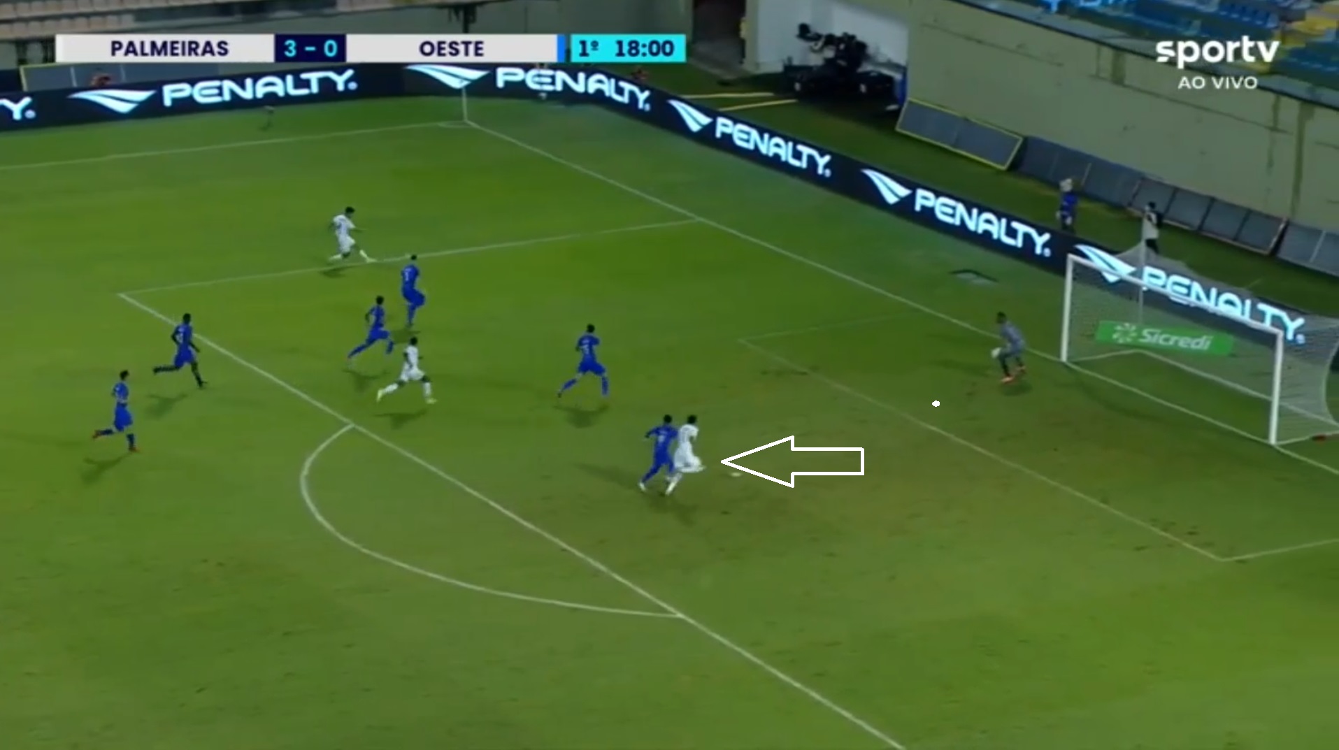 Giovani, as mentioned before, always played as the right-winger for this Palmeiras side. His first strength is his role in the positional play of Palmeiras under 20. The winger likes to drop deep when Palmeiras are building out from the back. By doing this he usually drags his direct opponent with him which opens up space for right-back Gustavo Garcia to run into. The right-back did not always make use of this, but one can only assume that players like Noussair Mazraoui and Devyne Rensch would make use of this. This situation will always lead to either space behind the opponent’s left-back or space for Giovani to carry the ball forward.