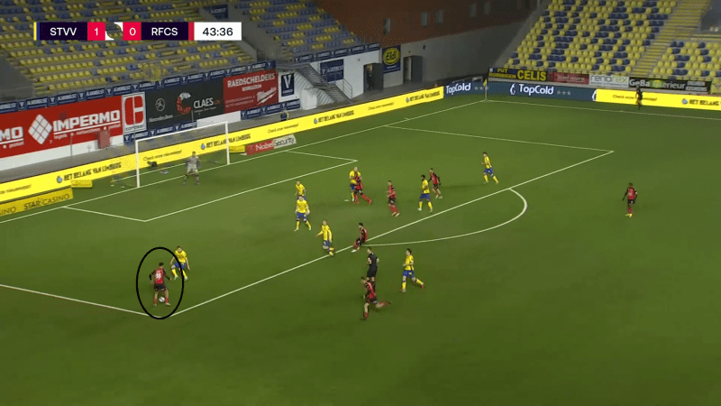 Youssef Maziz played as the left attacking midfielder for RFC Seraing and like all of his teammates also had a difficult game. In possession Maziz would either move up quite far forward as sort of a left winger/second strike or he dropped back to support the two central midfielders, but this was mostly dependent of his counterpart on the right, Antoine Bernier. If Bernier was very far up the pitch, Maziz would drop back a bit and vice versa. Standing at 5’9” and not being the fastest player, his main strengths are his technical abilities. Maziz has good dribbling using both feet and is a very tricky player. Sometimes it just really felt like he was playing on the street. Maziz also showed to be a very smart player with good awareness of his opponents and teammates. He scanned very well before taking a touch and also on the ball. In the 44th minute this lead to a very nice pre-assist to Mathieu Cachbach. After a corner Maziz had the ball on the edge of the box. He faked a pass to Mikautadze in the middle and with one smooth movement he played the ball to Cachbach who made an overlapping run on the left. Nadrani then scored from Cachbach’s cross.