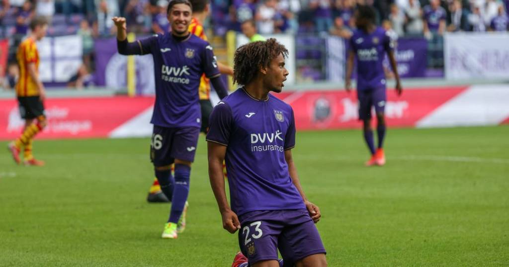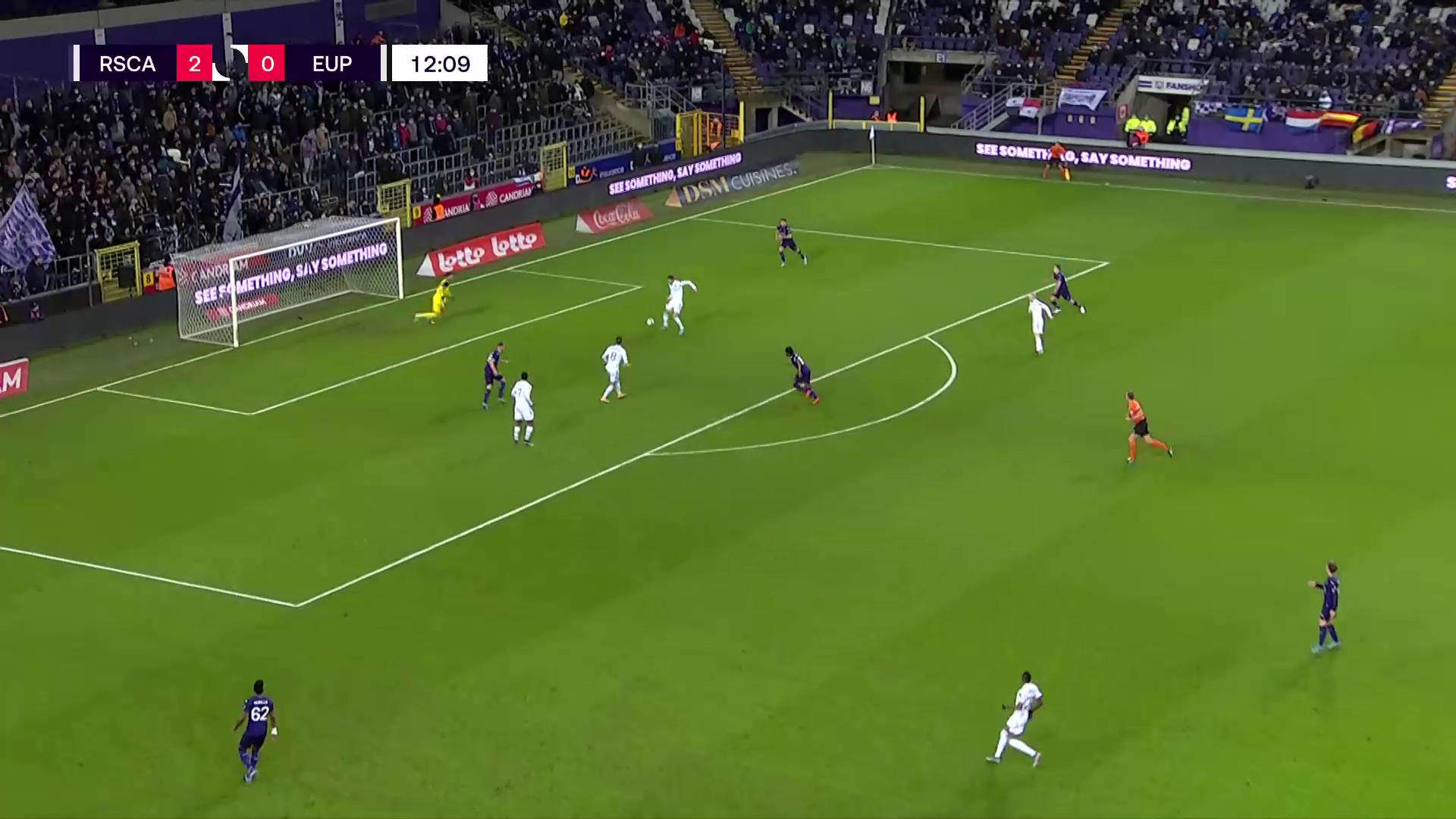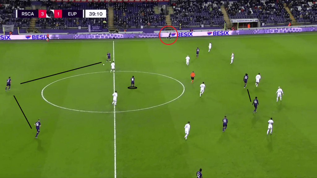 Vincent Kompany sent his side out in a 4-4-2 formation with Joshua Zirkzee as left-sided striker next to Christian Kouamé. The Dutch striker played a really solid game and scored two good goals. In the third minute, Zirkzee put good pressure on centre back Heris and recovered the ball. After a long run he stayed cool in the one on one with Eupen’s goalkeeper and finished with his left foot. His second goal of the game was an absolute beauty. After a cross from Anderlecht’s right back Murillo was deflected, Zirkzee placed the ball in the corner with a lovely overhead kick.