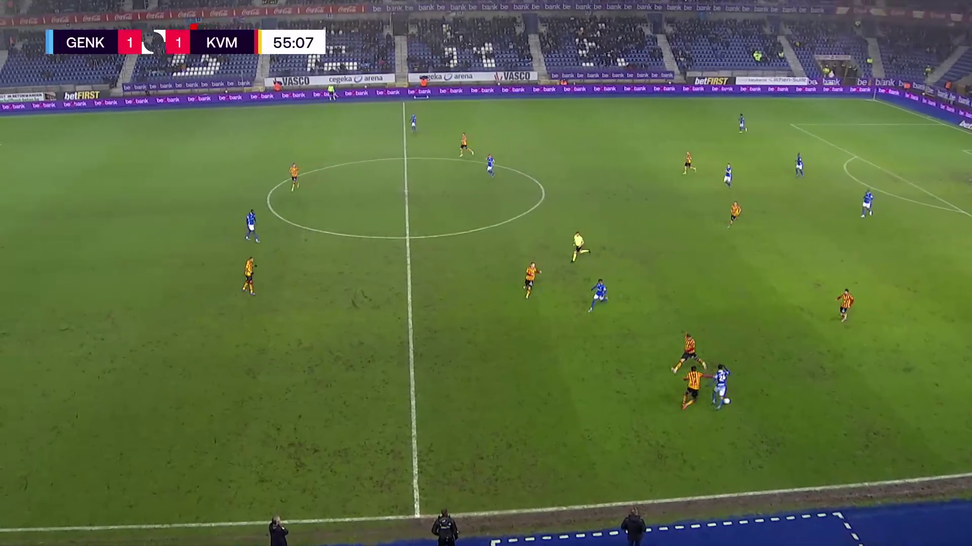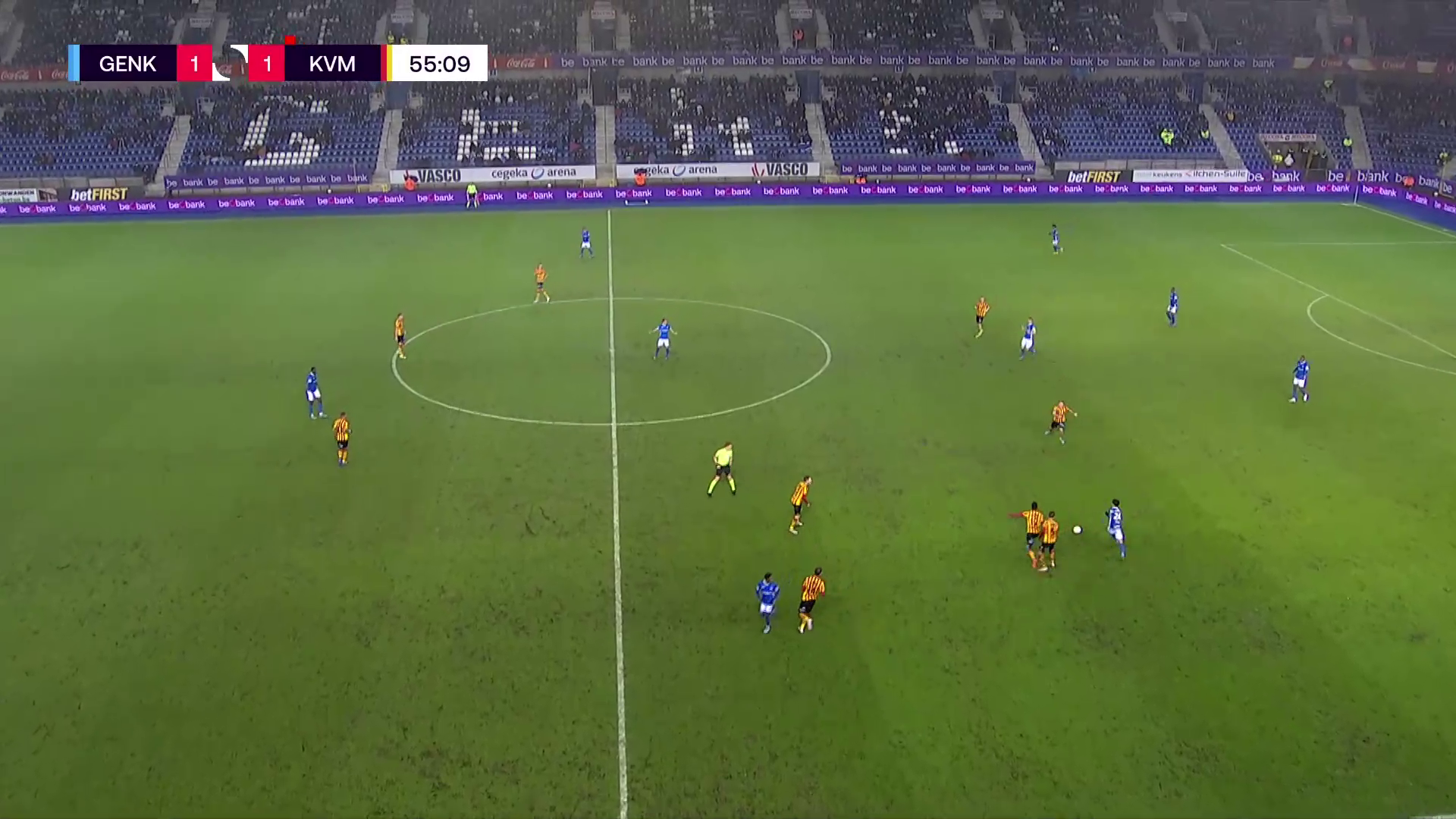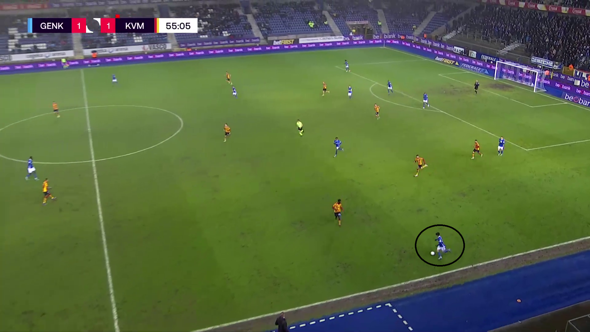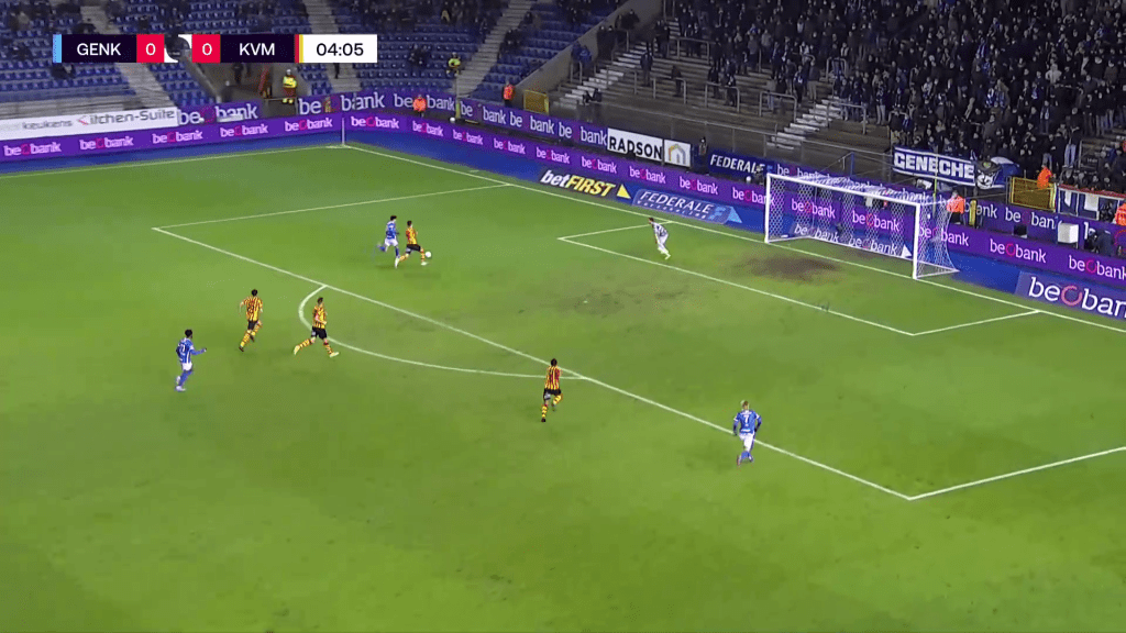 After five minutes Trésor got the ball from Paul Onuachu around the halfway line in a counter-attack. He dribbled forward with the ball, with two defenders in front of him, and played a lovely through ball to Luca Oyen on the left. Oyen finished the ball from a difficult angle giving Genk the lead. Twenty minutes later he got the ball from a Mechelen player in midfield. This time he played another great through ball, with his weaker left foot, towards Paul Onuachu who got taken down, resulting in a red card for Thibault Peyre.