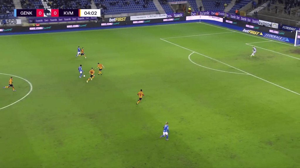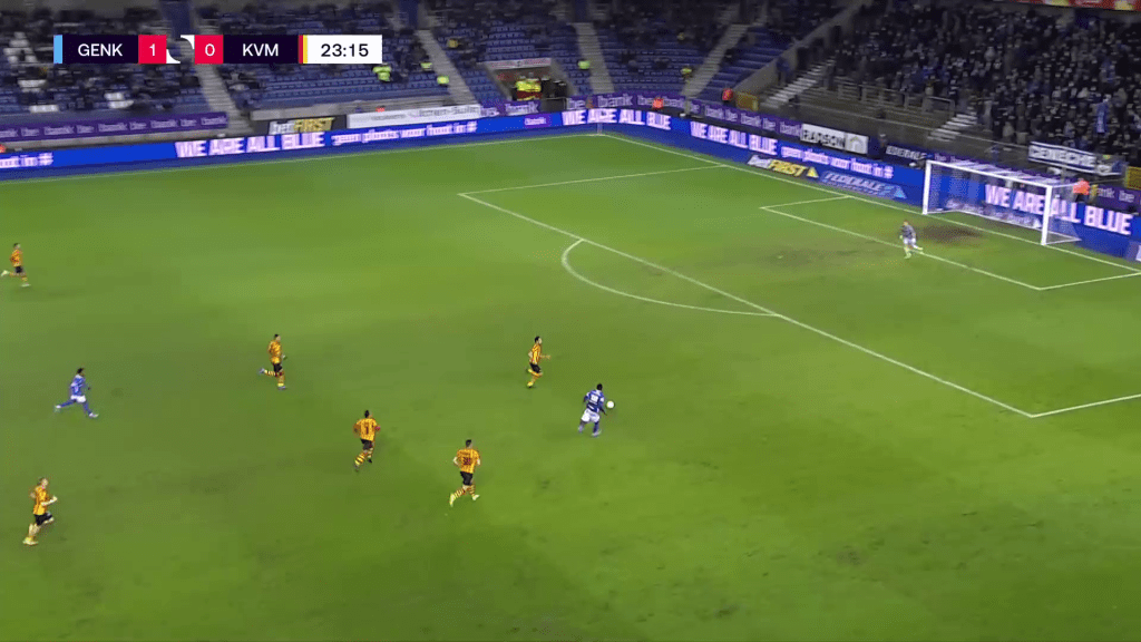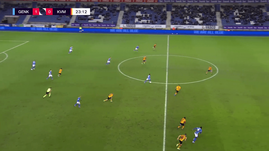 Angelo Preciado played as right back against KV Mechelen and got acres of space after Peyre’s red card. The right back was basically a second right winger being on his opponents’ half more than on his own half. Preciado saw a lot of the ball and was involved in a lot of dangerous attacks on the right. The Ecuadorian defender isn’t the tallest standing at 5’8”, but did very well in his defensive duels. He used his body very well and paired this with great aggression. I don’t think he lost a single defensive duel throughout the whole match.