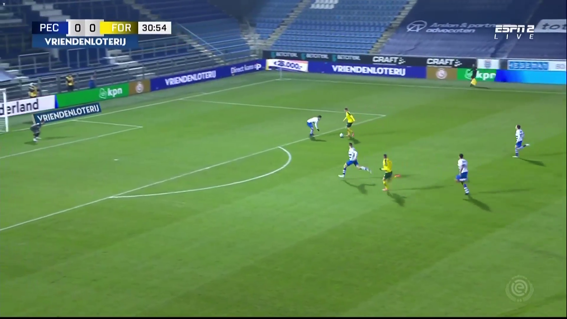 With the ball at his feet Flemming is also very comfortable. His dribbling is good and also uses his left foot when he has the ball when he needs to, making him more unpredictable. He has tight control of the ball but in tighter spaces sometimes takes a touch which is a bit too heavy, which he then instantly tries to recover by shielding the ball with his body. Usually when Flemming has the ball on the edge of the box with a bit of space, he takes a touch and tries to shoot. Mostly with his right foot, but he good shot in his left foot as well. This season though, especially at the start of it, there were a few situations in transition where he did very poorly in a 1v1 with a defender around the edge of the box. In this example below against PEC Zwolle, he gets a deep pass on the right-wing. After taking a bit too long, he then tries to cut inside to his left foot but the touch wasn’t good and he loses the ball. Later on in the season, he seemed to regain some confidence but there were a few similar situations this season in which he should’ve done better.