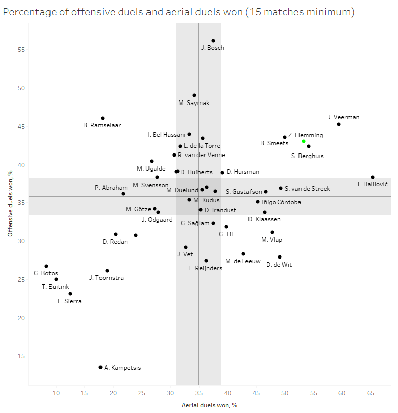 Zian Flemming differs from the ‘average’ attacking midfielder in his physical presence. He stands at 6’1”/1,85m tall an athletic build. He is quite the powerhouse in midfield and uses his body very well in duels or to shield the ball in smaller spaces. He is easily able to outmuscle smaller opponents and you will not see him lose his balance quickly. The 23-year-old is also very strong in aerial duels. He has a good leap and times his jumps very well. Offensively he also poses quite the threat in the air. He heads the ball down, when going for goal, whilst also accurately aiming it in the corner of the goal. If you look at the data on his offensive- and aerial duels and compare him to other players in the Eredivisie who played as attacking midfielders, you see he mainly stands out in the air.