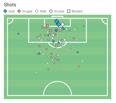 When Flemming gets or creates the opportunity to shoot though, he gets really dangerous. He strikes the ball with a lot of power and often tries to take shots from outside of the box. He is a great finisher from inside the box with both feet and showed that this season as well. He overperformed his xG of 10.62 with 12 goals in the league even though he had a few 1v1s with the goalkeeper which he didn’t covert.