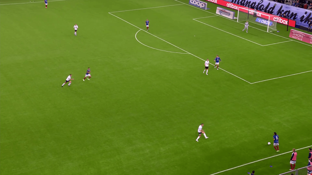 Joshua Kitolano played as the left-sided centre midfielder against Valerenga but had a pretty weird role overall. When Odds BK were in possession the two full backs would instantly push very far forward, providing width for their side. This could’ve been pretty dangerous, but as I pointed out earlier Odds almost never used these pushed-up full backs, constantly looking for combinations in the centre. In the end, this only resulted in a multitude of very dangerous counter attacks from Valerenga, which miraculously didn’t end in a goal. Here one of Kitolano’s weaknesses became pretty clear, which is his speed. There were a few times when Valerenga’s right-winger Layouni easily sprinted past Kitolano with the ball at his feet since Kitolano was basically playing as left-back in these moments of transition. Standing at just 5’7” his whole physical profile