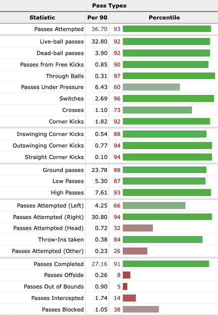 Despite his many offensive gifts, Ferreira is not the most clinical goal scorer of all time. Ferreira averages only 0.36 expected goals per game. That’s nothing to sneeze at but it is a little on the low side for a striker. Part of this is a trade-off for Ferreira’s link-up play. Because he is always dropping deeper, he can’t always be in the penalty area. But I have also noticed that sometimes he seems to lack the killer instinct to make the run to the dangerous areas of the box. Instead, his instinct is to float around the top of the box, waiting for the ball to be cut back to him. You can see this in the fact that he has an average shot distance of 17.6 yards, which is quite far away for a striker. This can all work in the right setting. On a team where the main scoring threats are the wingers or he was paired with another striker, Ferreira would thrive. But anybody signing him to be the main goal threat for the team is setting themselves up for disappointment. Conversely, if Ferreira can improve his tap-in game a bit, he would become a truly elite striker. He’s 21 so there is still time for him to make some adjustments to his game. In a sense, the fact he’s this effective with this kind of weakness in his game might make him extra appealing to development clubs who would be looking to eventually flip him for a profit.