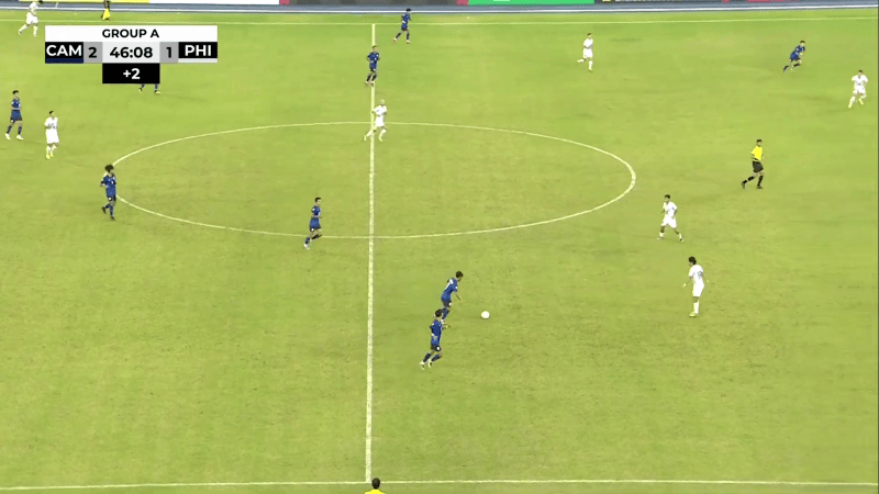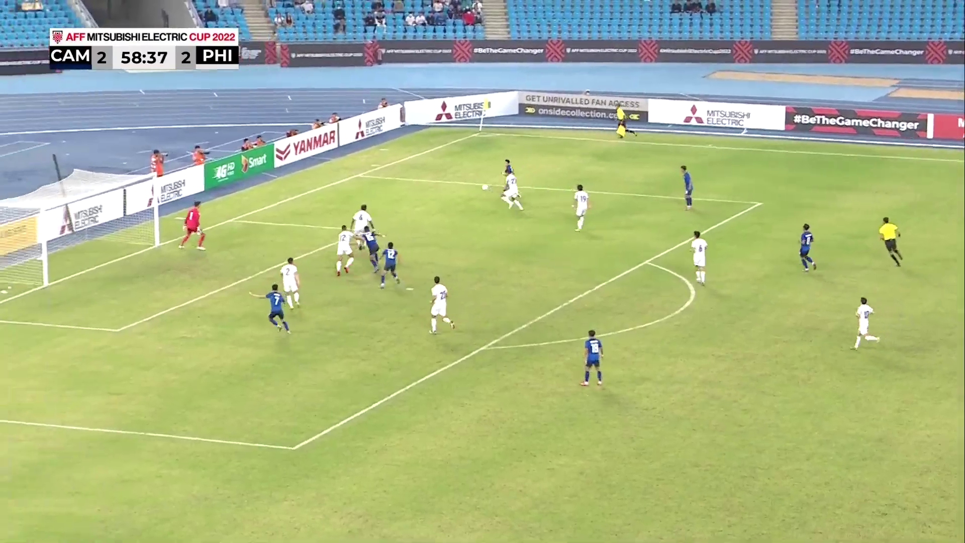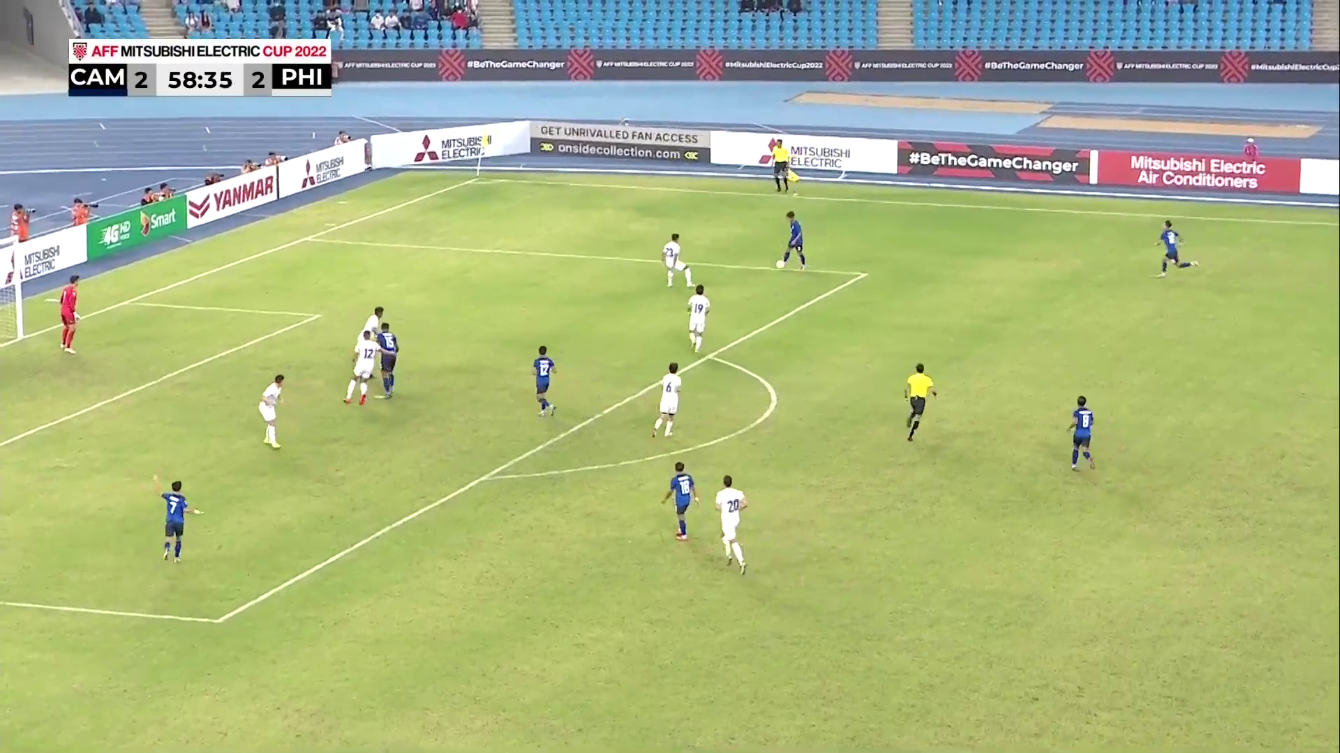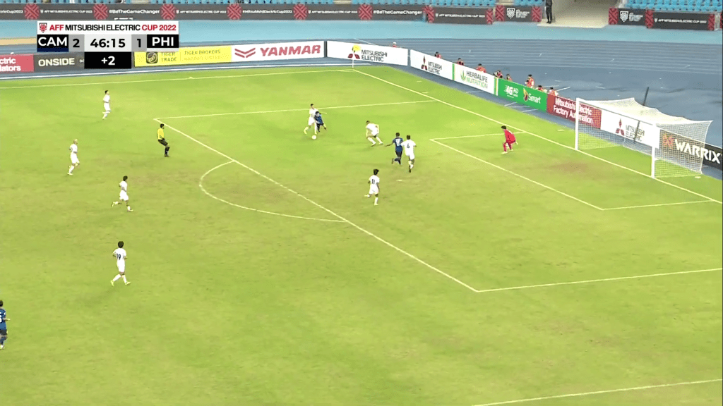 Cambodia started their campaign for the AFF Mitsubishi Electric Cup with a surprising win against the Philippines. Cambodia lined up in a 5-2-3 which was very dynamic. Out of possession, they would either play a low defensive block, which turned it into a 5-4-1, or they would try and disrupt the Philippines in their build-up making it look more like a 3-4-3. In possession, Cambodia looked very comfortable with a lot of moving players. They would often play one or two-touch football. Keisuke Honda’s side gave an absolute masterclass at times in the first half and was unlucky to be only 2-1 up at the break. Quickly in the second half, the Philippines equalized and it looked like they were taking over control of the game, but a lovely attack over the right won Cambodia the game with 3-2.