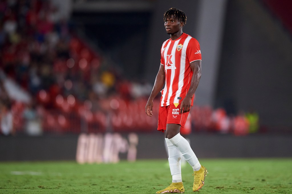 El Bilal Touré is a 185 cm tall center forward with a filled-out, physical frame who played 89 minutes before being subbed off by Almería. He is a summer signing from Stade Reims with 3 goals in 9 appearances. Touré displayed long strides that translated to quick pace in this match and got up high in the air for duels—showcasing his excellent jumping ability and explosiveness. He was not afraid of contact but that led to some overly physical duels where he fouled opponents, especially in the air.