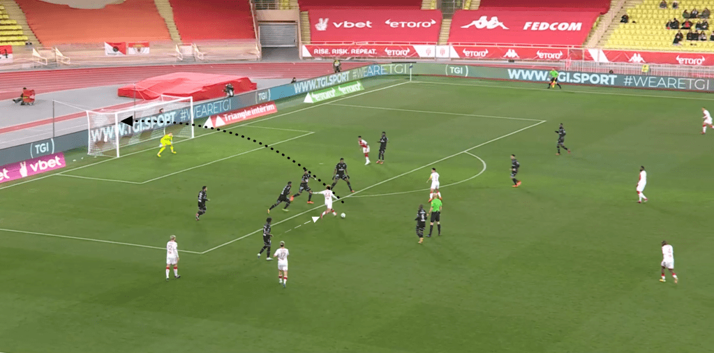 The Monaco man possesses a wonderful eye for goal and particularly loves a long shot, as shown above. He enjoys cutting inside from the left wing and curling a powerful shot at goal. He is very accurate with his shooting and more often than not will hit the target, having bagged 4 goals this season, it’s fair to say that if given more minutes next season, the youngster will be able to contribute even more goals to the Monaco cause. His willingness to take on these low percentage shots is a perfect example of the confidence this young man exudes, he displays an admirable belief in his own abilities which thus far has been supported by his performances on the pitch.