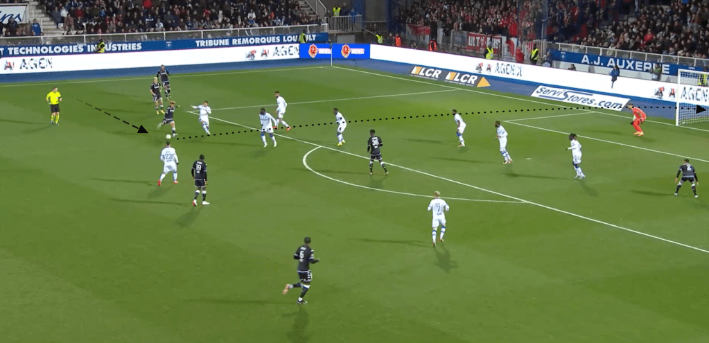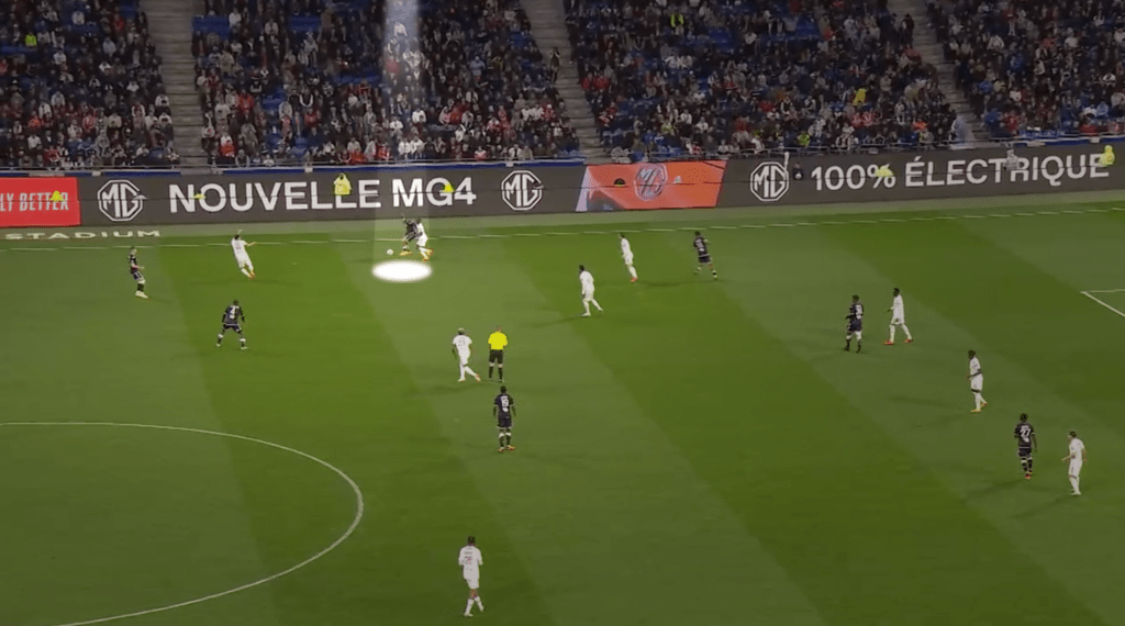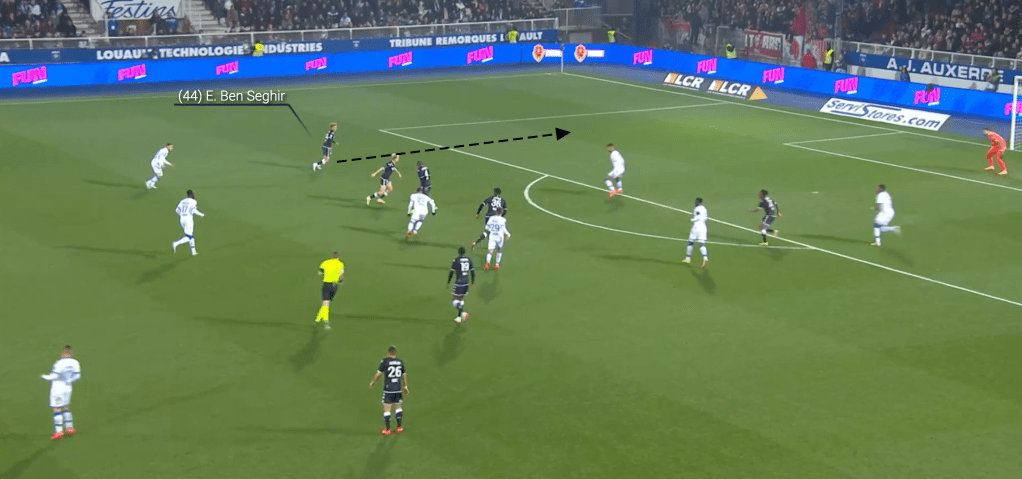 As shown in the images above, the 18-year-old enjoys picking up pockets of space on the left side, he mostly looks to operate in the half spaces which allow him to make late runs into the penalty area. Ben Seghir demonstrates some wonderful tactical awareness throughout he is constantly scanning the play around him and is able to take up excellent positions on the pitch so he is always open to receive a pass.