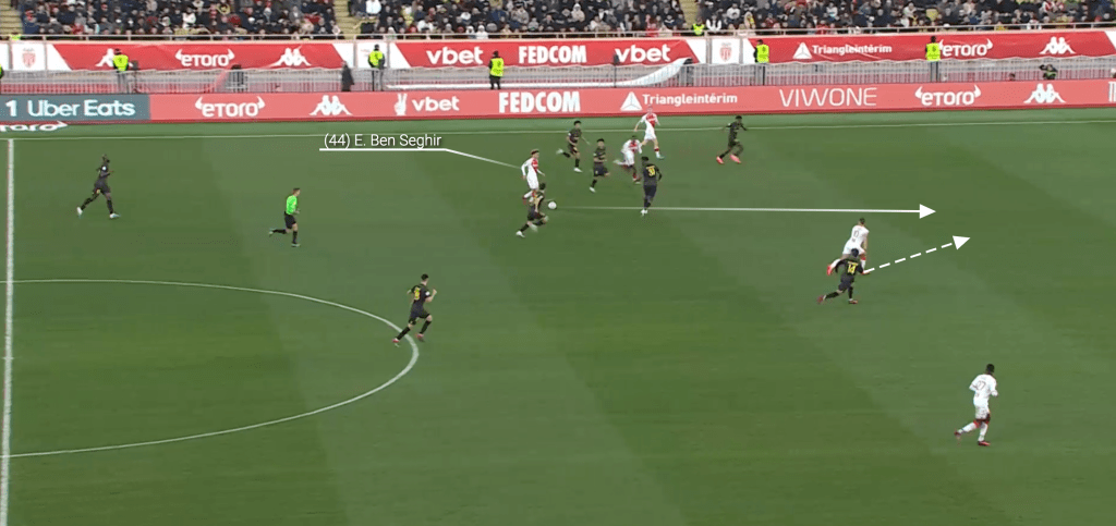 Eliesse Ben Seghir is extremely comfortable in possession, he plays with a confidence and a composure that makes you instantly forget that he is just 18-years-old. When Monaco are transitioning into the attacking phase, he is able to carry the ball up the pitch and progress the play. He has an eye for a pass, especially when teammates are willing to make runs in behind the defensive line, as shown above. His close control means that he is able to dribble his way past defenders who are trying to tackle him and his agility means that he is able to change direction at speed which provides him with enough space to execute a pass or a shot.